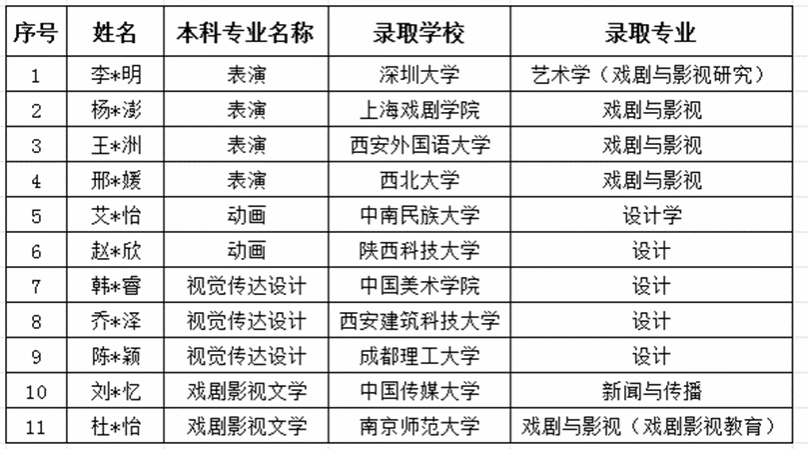 本科生培养的过硬质量。他们的去向涵盖了中国美术学院、上海戏剧学院、中国传媒大学、深圳大学、西北大学、中南民族大学、陕西科技大学、西安建筑科技大学、成都理工大学、西安外国语大学等高校的相关艺术类专业,其中不乏“双一流”高校和高水平艺术类院校,攻读方向包括艺术学、设计学、新闻与传播、戏剧与影视学等多个领域,实现了在学术深造道路上的高质量跨越。