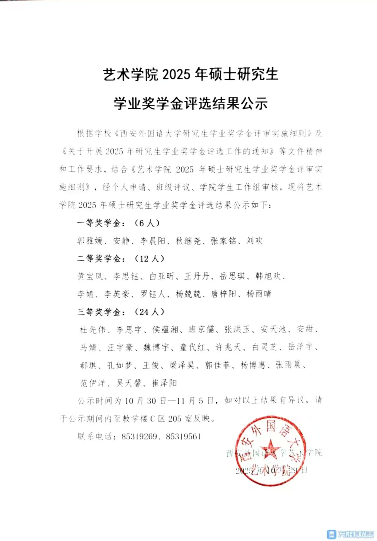 根据学校《西安外国语大学研究生学业奖学金评审实施细则》及《关于开展2025年研究生学业奖学金评选工作的通知》等文件精神和工作要求,结合《亚博体育 2025年硕士研究生学业奖学金评审实施细则》,经个人申请、班级评议、学院学生工作组审核,现将亚博体育 2025年硕士研究生学业奖学金评选结果公示如下: