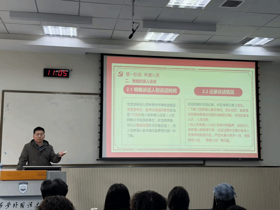 冯鑫系统讲解了入党的具体条件与规范流程,从提交入党申请、积极分子培养,到发展对象确定、预备党员接收与转正,清晰展现了从积极分子成长为正式党员的完整成长路径。他强调,入党不是“终点”,而是持续锤炼的“进行时”,每一个环节都是党组织对学员思想、作风与行动的全面检验,鼓励大家在日常学习生活中践行初心、不断积淀。