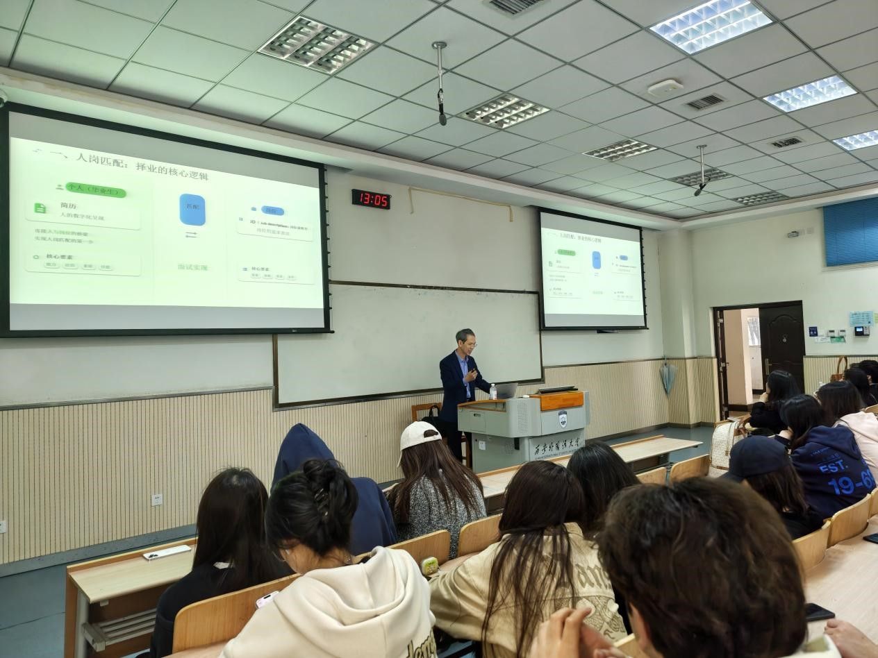 活动现场,于老师结合自身十余年人力资源管理与校园招聘经验,深入浅出解读AI时代就业新趋势,系统演示了秘塔AI搜索与智谱清言AI就业指导智能体两大实用工具。从论文撰写、行业研究到简历优化、岗位匹配、模拟面试全流程辅导,于老师手把手教学,让同学们快速掌握AI工具的使用技巧,切实解决写论文难、改简历慢、面试无经验等实际痛点。他重点拆解“人岗匹配”核心逻辑,强调简历需“一岗一简历”,精准对接岗位关键词,并通过真实案例展示AI如何大幅提升简历通过率与面试备战效率。